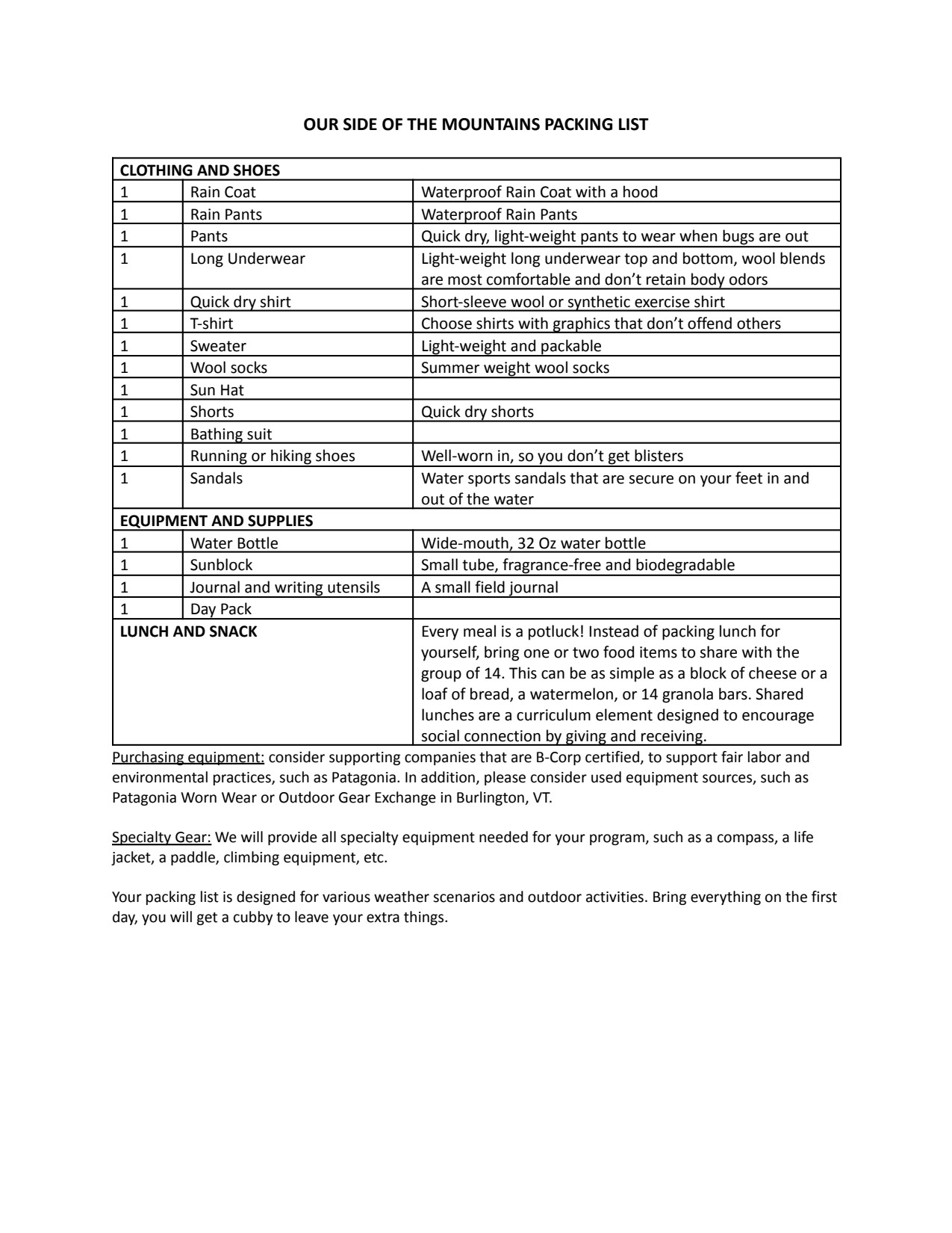 PACKING LIST FOR OUR SIDE OF THE MOUNTAINS